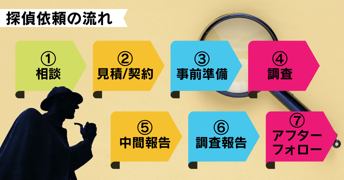 探偵への依頼は、以下の流れで進みます。事前に準備する情報が多ければ多いほど、調査費用や期間を抑えることができます。
