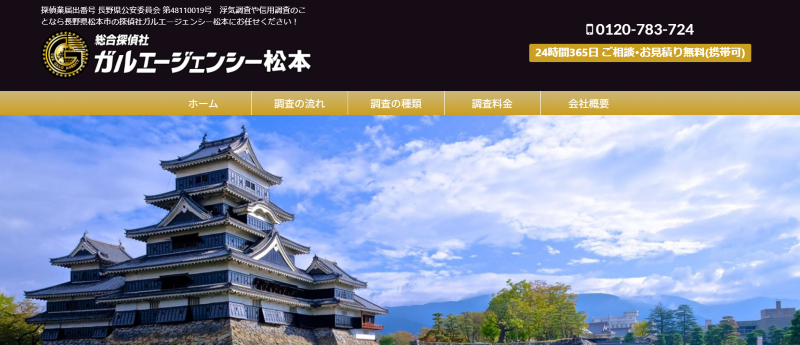 ガルエージェンシー松本は、松本市を拠点とし長野県全域で活動する地域密着型探偵社です。全国124拠点のネットワークを誇るガルグループの一員でありながら、地元密着の丁寧な調査で高い評価を得ています。浮気・不倫調査を中心に、婚前調査・人探し・企業信用調査など幅広い案件に対応。長野県公安委員会の届出(第48110019号)を取得し、法令順守を徹底しています。